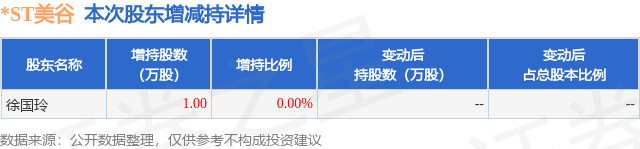 证券之星消息申请股票配资,1月4日*ST美谷发布公告《*ST美谷:简式权益变动报告书(信美通成)》,其股东徐国玲于2025年11月14日合计增持1.0万股,占公司目前总股本的0.0013%,变动期间该股股价上涨0.0%,截止11月14日收盘报4.77元。